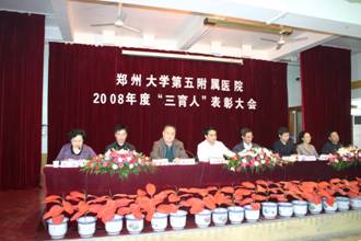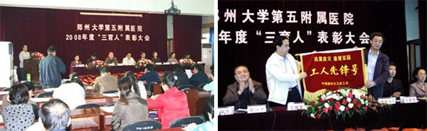 2008年10月8日下午,我院2008年度“三育人”表彰大会在门诊五楼大教室隆重召开。会议由党委副书记纪委书记郑兴太主持,院长李新华宣布了表彰令,工会陈琳主席宣读了“十佳名片”表彰决定。08年,我院抗震救灾医疗队被中国教科文卫体工会授予“抗震救灾、重建家园‘工人先锋号’”的荣誉称号;河南省教科文卫体工会授予我院“职工之家建设示范单位”荣誉称号,授予王江波同志“河南省护理职业道德标兵”荣誉称号;郑州市总工会授予骨外科“五一劳动奖状”,授予王玉洲、王江波两位同志“五一劳动奖章”;大会还表彰了45名郑州大学“三育人”先进个人、135名院级“三育人”先进个人和在医院开展的“祝您成为医院的名片”活动中首批推出的10名同志。河南省护理职业道德标兵、郑州市五一劳动奖章的获得者王江波代表受表彰的同志作了发言。
