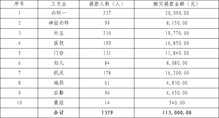 根据郑州大学党委、校工会的统一部署和院工会关于《向青海地震灾区捐款》的通知精神,全院职工发扬中华民族“一方有难,八方支援”的光荣传统,紧急向地震灾区进行捐款,为灾区人民奉献一份爱心、贡献一份力量、送出一份温暖。本次捐款活动按照校工会通知的捐款标准,全院职工共同伸出援助之手,总计捐款113000元。肿瘤科医生师广勇在获悉玉树震灾后的第二天,就来到党支部积极捐款并表达了到灾区救援的决心。张自森、张丹、桑艳霞等同志写下了情真意切的请战书,表现了一名医务工作者随时等待祖国召唤、奔赴抗震一线的责任感。李润兰、汪惟实、郝杰、赵雪琳、乔淑芳等退休老同志,在得知了消息后,于第一时间踊跃捐款,用实际行动帮助灾区人民尽快度过难关。