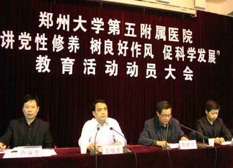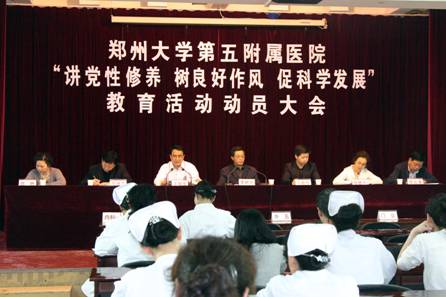 根据河南省委和郑大党委关于在全体党员干部中开展“讲党性修养、树良好作风、促科学发展”教育活动的指示精神,我院于4月14日下午召开了郑州大学第五附属医院“讲党性修养、树良好作风、促科学发展”教育活动动员大会。领导班子全体成员参加了动员大会,院党委副书记、院长李新华同志对我院“讲、树、促”教育活动具体实施方案及学习提高阶段的工作进行了具体的安排部署,院党委书记王瑞堂同志做了动员讲话,全体党员和中层干部200多人参加会议,这标志着我院“讲党性修养、树良好作风、促科学发展”教育活动全面启动。