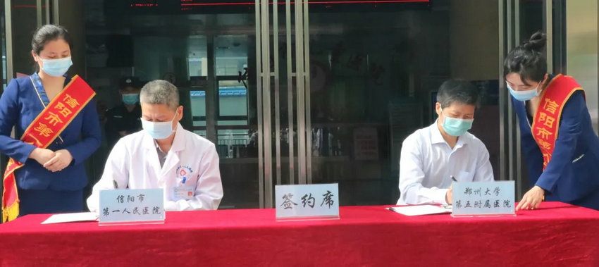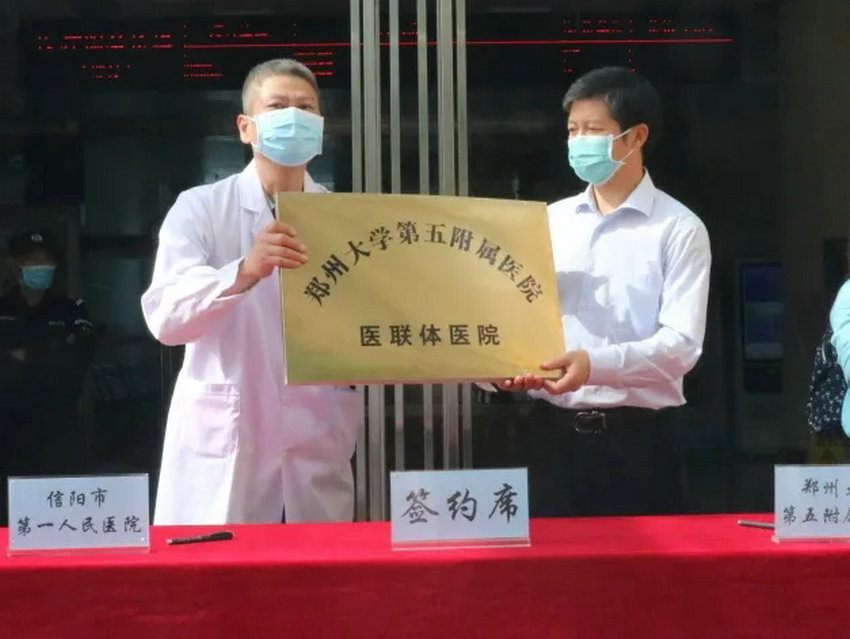 2021年5月18日,信阳市第一人民医院加入郑州大学五附院“紧密型医疗联合体”签约揭牌仪式暨义诊、查房、等技术交流活动在该院举行。郑州大学五附院党委书记王新军、副院长朱光,信阳市卫健委党组成员、副主任黄楚安,信阳市第一人民医院党委书记肖明星,党委副书记、纪委书记郑怀华出席签约暨授牌仪式。郑州大学五附院神经外科、血管外科、胃肠甲状腺外科、脊柱骨病科等科室专家参加签约授牌仪式。仪式由信阳市第一人民医院党委副书记、纪委书记郑怀华主持。