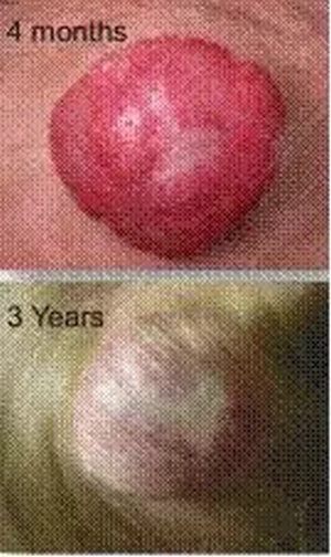 在血管瘤早期,对局部打针注射可有效地阻止血管瘤增生。就如刚破土而出的嫩草,容易除尽、等后期根深蒂固就难除尽(图2)。而血管瘤前期没有及时阻止生长,而后期退化不全可能影响外观,甚至需要手术治疗。