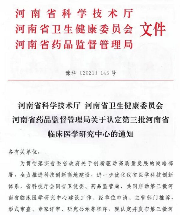 2021年9月29日,河南省科学技术厅、河南省卫生健康委员会、河南省药品监督管理局联合召开第三批省临床医学研究中心建设座谈会。河南省科技厅刘保民副厅长在会上表示,河南省自开展省级临床医学研究中心建设以来,不断加强临床医学研究,开展高水平科技攻关,产生了一批具有一定影响力的科研成果,有力的推动了全省医学科技创新能力的提高。他强调获批省级临床医学研究中心的单位要不断地整合优化资源,做到强核心、聚优势、大网络、促协作,将国家级临床医学研究中心的标准作为建设的目标,努力实现一流平台、一流课题、一流人才和一流生态。