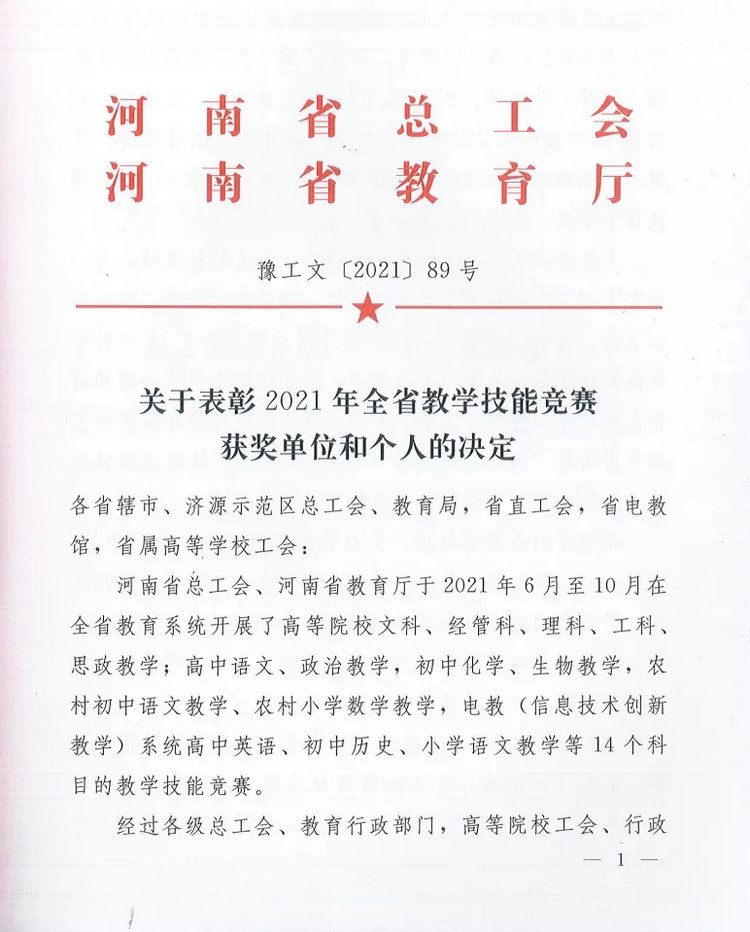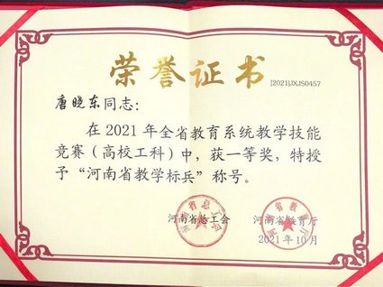 近日,河南省总工会、河南省教育厅联合印发了《关于表彰2021年全省教学技能竞赛获奖单位和个人的决定》(豫工文〔2021〕89号)文件,公布了全省教育系统教学技能竞赛结果。郑州大学五附院外科教研室教师唐晓东在医院工会的大力支持和教学与学科办的具体指导下,经过层层选拔和激烈角逐,最终荣获河南省高校工科组一等奖,被授予“河南省教学标兵”称号。