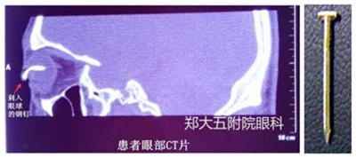 近日,眼科门诊接诊了一位特殊的“眼中钉”患者。该患者在装修时不慎被钢钉击中左眼,疼痛难忍,视物不见。门诊郭娟副主任医师为患者检查后,发现一根钢钉斜行刺入患者眼球,约1.5cm长断端暴露在外,情况危急。病房值班医师及护士接到电话通知后,立刻为患者开放绿色通道,办理入院。主治医师魏丽娟亲自陪同患者到CT室,CT室迅速为患者进行了眼部CT扫描,发现左眼球内巨大钢钉(见图片)。正在进行手术的周利晓主任医师获悉患者病情,立刻通知手术室准备急诊手术,并准备冷冻机及玻璃体切割仪备用,尽快取出异物,避免异物移位继续造成损伤,挽救患者视力。结束了一上午手术的周主任来不及片刻休息,带领科室同志详细分析该患者的CT片,制定了详尽的手术方案,急诊为患者进行微创眼内异物取出及缝合,尽可能减轻已破裂眼球的二次损伤,稳妥取出一枚长约3cm“眼中钉”。精心的手术设计及微创手术处理,加之合理的术后管理,使患者术后第一天视力就恢复到了0.5。