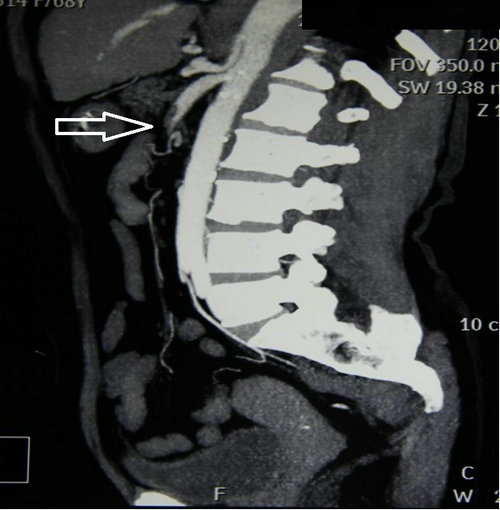尚老太太今年84岁高寿, 1天前吃了个橙子后,突然出现腹痛、腹泻症状,被子女连夜送到郑大五附院消化内科。王长武副主任医师立即进行检查,在排除了急性胰腺炎、阑尾炎、胃肠炎后,当机立断做了腹部动脉CTA,结果发现肠系膜上动脉堵了,立即请血管外科医师会诊,急转该科。王兵副院长、崔文军副主任指导值班医生马上完善术前检查,紧急进行手术。