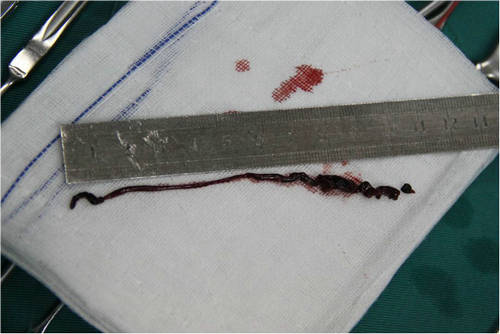 由于患者年龄大,冠心病、房颤20多年,基础情况差,术前请心内科关李华副主任及手术室闵娜医师前来会诊,给予制定围手术期处理意见。手术麻醉由胡强夫主任亲自进行,王兵副院长主刀。手术开始后发现肠管已经缺血发绀,幸运的是诊治及时,还未出现坏死迹象,腹腔也没有腹水。将肠系膜上动脉游离出来,取栓管取出的血栓将近10cm。缝合血管恢复血流后,肠管立即恢复红润,蠕动也明显改善。
