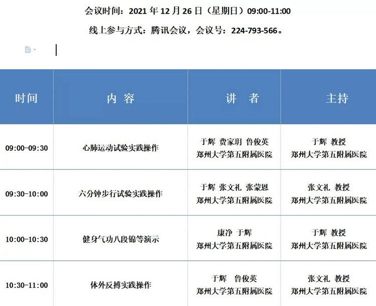 国家级继续医学教育项目:2021心肺康复三级流程管理和策略培训班(项目编号:2021-03-01-093 (国))由郑州大学第五附属医院主办,论坛将于2021年12月24日-26日在郑州举办,本次培训班贯物“健康中国2030”战略,提升心肺功能,改善患者生存质量,时将邀请国内著名专家学者线上授课,参加论坛者将授予国家级继续教育1类学分5分,免收注册费。本次论坛将采取腾讯会议线上形式举行,诚邀您线上参加本次论坛。