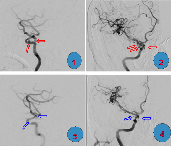 图1、图2:颈内动脉多发(3个)动脉瘤(图中红箭所示);