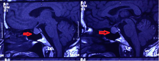 近两个多月来,患者王女士感到右眼视力明显下降,伴有头痛,起初她以为是近视加深,没想到到郑州大学五附院检查,头部磁共振在她的脑袋里找到一颗红枣大小的脑垂体瘤(图1)。