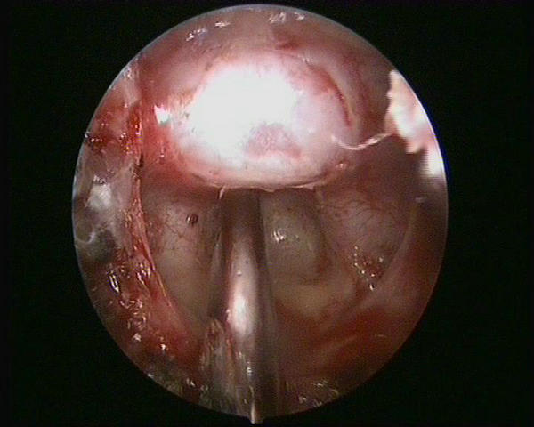 经神经外科专家组分析讨论病例,付旭东副主任决定采用创伤小、出血少的神经内镜技术切除肿瘤。这是神经外科的一项新微创技术。手术当日,在麻醉科、手术部的大力配合下,由神经外科一病区付旭东副主任操刀,由患者鼻孔插入直径仅4毫米的高清神经内镜,直视下避免颈内动脉、视神经、垂体柄等重要结构的损伤。经过2个多小时的细致暴露、分离和切除,顺利地全切了肿瘤,整个手术过程清晰地显示在巨大的高清电视屏幕上,流畅而精彩(图2、3、4)。