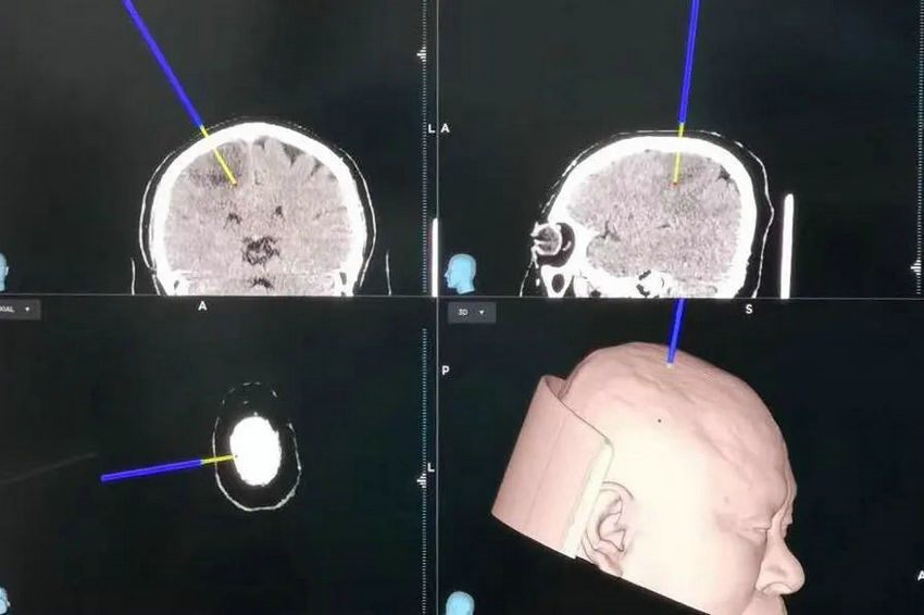 手术如期开始,在神经外科手术导航技术辅助下,精准定位肿瘤病灶,尽可能减少手术创伤。完成相应的手术步骤后,麻醉医师对其进行术中唤醒,赵先生完全清醒、逻辑清晰,但没有感到任何疼痛,还和手术医师一问一答地“聊起来”。在聊天的过程中,通过功能区皮层电刺激技术及神经电生理监测技术,确认了脑功能区皮层的准确位置和安全的手术路径,采用肿瘤荧光示踪技术,明确了安全的手术范围。肿瘤切除后,手术室内即刻行CT扫描验证,术后赵先生再次醒来,四肢运动及感觉功能完好。目前,经过术后的治疗,患者左侧肢体运动及感觉功能已经恢复至正常。