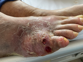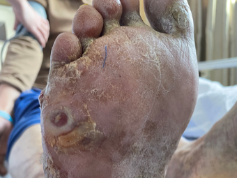 血管外科创面治疗组组长王颖博士接诊后,发现老张右足前中足红肿明显,局部皮肤已破溃,足底存在一贯通性溃疡,足底胼胝体,但末梢循环尚可,可触及到下肢动脉搏。通过研判,王颖博士确认患者为“典型糖尿病性足坏疽”,并已继发严重感染,需尽快切开引流,否则进一步发展确实存在截肢风险。