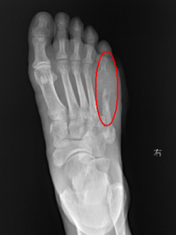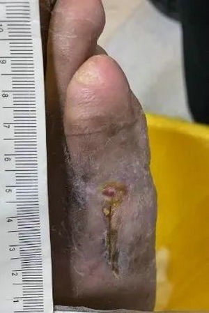 王颖博士为老张实施的对穿引流、冲洗创面直至无脓液渗出,并给予抗感染治疗。术前检查显示,老张的右足第5趾跖骨骨质均破坏,合并骨髓炎,并存在下肢动脉硬化、糖尿病的情况。