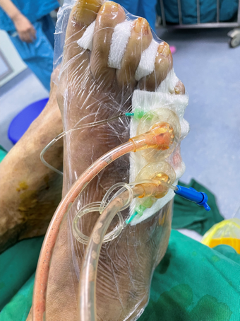 通过对老张的病情进行糖尿病足多学科联合会诊(MDT)管理,组内的内分泌科余玲副主任医师指导其调整血糖、改善饮食。骨科何江涛主治医师考虑到老张右足坏死合并骨髓炎,无严重缺血,建议应尽快彻底清创,去除死骨,同时联合封闭式负压引流治疗。完善术前各流程后,由王颖博士与何江涛主治医师共同实施,成功清创并去除死骨,清创完毕后创面给予封闭式负压引流,并给予生长因子灌注冲洗。