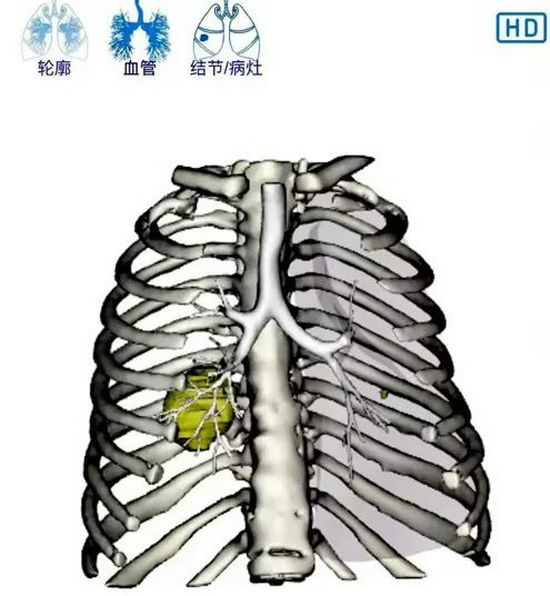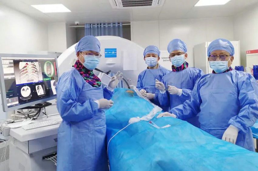 接受此项技术治疗的是名被确诊右肺鳞癌晚期的65岁男性患者,之前曾进行化疗联合免疫治疗,多发淋巴结转移基本消失。但遗憾的是,右侧肺部的原发肿瘤并未缩小,在进行免疫联合抗血管药物维持治疗过程中,原发肿瘤逐渐增大并且侵犯肋骨出现重度疼痛。经过沟通,患者希望能够通过微创治疗从而减轻疼痛症状。经过肿瘤内科团队周密的术前分析,决定为其进行IQQA-Guide人工智能磁导航联合CT同步引导新技术下进行肿瘤粒子植入治疗。