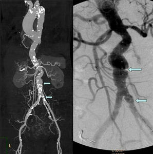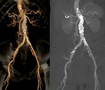图左:术前CTA提示腹主动脉及髂动脉夹层。