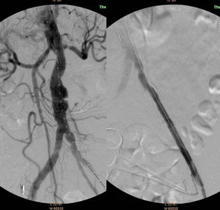 图右:术中造影明确腹主动脉及髂动脉夹层。