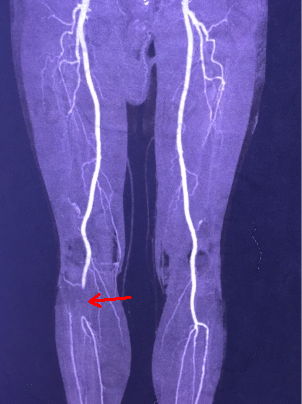 患者半月前突然出现右小腿及右足疼痛、发凉,且疼痛症状逐渐加重,同时出现右足紫绀。在当地医院溶栓治疗后,右下肢疼痛、发凉、麻木症状不仅没有改善,反而进一步加重,患足濒临坏死,当地医生建议截肢治疗。