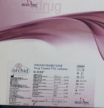 针对这一手术,王兵教授指出:下肢动脉硬化闭塞症是指下肢动脉由于粥样硬化病变引起的管腔进行性狭窄或闭塞,作为外周动脉病变( PAD) 最常见的一种类型,在老年人群中有着极高的发病率。血管成形术是外周动脉病变的一种常规治疗手段,它是通过置入球囊或支架的扩张作用排除血管的狭窄和闭塞,但是术后再狭窄一直是这项微创手术的重要缺陷。药物涂层球囊技术(DCB: drug coating balloon),是通过将抗血管增生药物涂于球囊导管表面,通过抑制内膜增生从而减少再狭窄。国外关于DCB 的临床研究显示,药物涂层球囊在治疗周围动脉(血管直径为2~8 mm 或更小)狭窄时,其术后再狭窄发生率为5.5%,显著低于普通球囊治疗的31%的血管再狭窄发生率,目前药物涂层球囊在冠状动脉支架术后再狭窄中已经得到广泛的应用。2009年1月,外周球囊新产品紫杉醇洗脱球囊导管在欧洲批准上市,2014 年10 月,美国FDA批准首款治疗下肢动脉疾病的药物涂层血管成形术球囊导管。2016年,药物涂层球囊在国内上市(图5、6)。