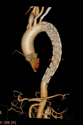 由于PAU患者年龄大,常伴有肺功能异常、肾功能不全或其他严重并发症者,为外科手术的高危患者,甚至失去治疗机会,且手术死亡率亦高达5%~20%,急诊手术死亡率更高。覆膜支架腔内修复术由于创伤小,安全性好、技术成功率高等优点,目前已成为PAU患者的首选治疗方案。