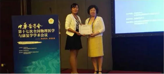 来自郑州大学五附院骨关节康复科一病区的靳翔愚主任在“慢性疼痛康复”专题中进行了“关键点疗法治疗神经根型颈椎病疗效观察”专题汇报,郭钢花教授的研究生李晓丽和李哲教授的研究生赵玉敏则分别在大会期间就“单侧脑干卒中后吞咽障碍患侧双侧颏下肌群表面肌电图研究”和“经颅磁刺激通过PEA-15对星形胶质细胞迁移的影响”做了口头报告。