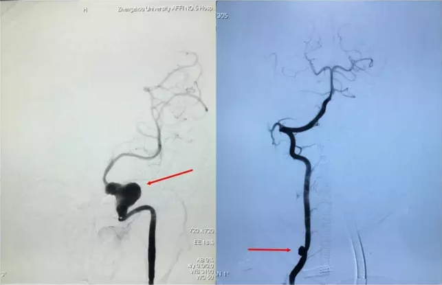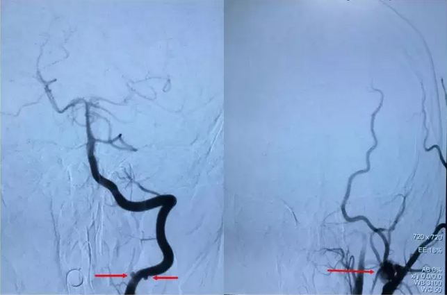 当家人见到寿记新教授并说明来意后,寿记新教授仔细询问了孩子的情况,并分析了孩子的检查结果。凭借多年的临床经验寿记新教授立即判断孩子得的不单纯是动脉瘤,而是肌纤维发育不良(FMD)。于是立刻收入院,安排梁博医师和周少龙医师为孩子做了全脑血管造影检查,结果和寿记新教授判断的一模一样——肌纤维发育不良(FMD),颅内多发动脉瘤:左侧颈内动脉虹吸段巨大瘤样扩张,左侧颈外动脉多发囊性动脉瘤,左侧椎动脉V3段起始部、右侧椎动脉V2段数枚动脉瘤。(图1)