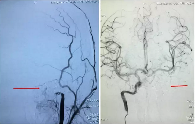 寿记新教授认为,该患儿动脉瘤多发不适宜行传统开刀手术,更适合于血管内介入治疗。于是在认真分析脑血管造影结果后制定了详细而缜密的治疗计划:右侧椎动脉动脉瘤行支架辅助动脉瘤栓塞,左侧颈内动脉海绵窦段巨大动脉瘤行动脉瘤栓塞+颈内动脉闭塞。手术过程非常顺利,术后造影:左侧颈内动脉未见瘤样扩张及远端显影,颈外动脉反流;右侧颈内动脉造影,左侧大脑前、中动脉显影良好,左侧颈内动脉无反流(图2)。术后李同学仅仅住院1周便顺利出院了,头痛症状完全消失并且没有留下任何后遗症。