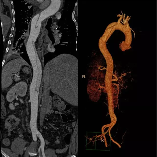如此凶险的疾病,治疗就是跟时间赛跑。通过CT室开通的绿色通道,20分钟内即完成胸腹主动脉联合CTA检查。结果支持崔文军副主任医师的诊断,但糟糕的是这个病人的主动脉破口紧贴左侧锁骨下动脉,向上累及主动脉弓及升主动脉,向下一直撕裂至双侧髂动脉,右侧肾动脉闭塞,左侧肾动脉真假腔供血,存在急性肾功能衰竭及下肢缺血坏死风险!