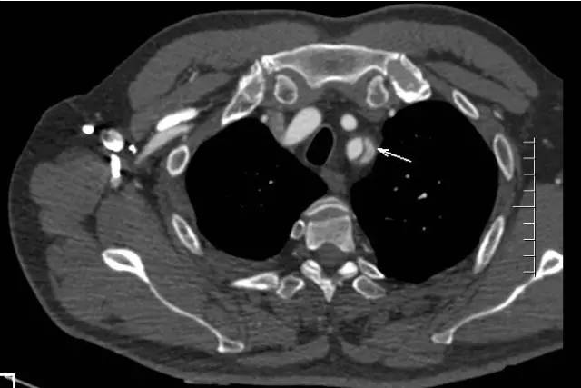 1周、2周、1个月,随着时间的推移,通过药物治疗,病人的情况逐渐趋于稳定,大家紧悬的心也都稍稍的放下了一些,而每次复查CTA也都让大家看到了希望。升主动脉及主动脉弓部的血肿逐渐吸收减少,终于在1个半月的时候再次复查CTA,血肿基本吸收完全,有了腔内治疗的条件!因为破口位置紧贴左侧锁骨下动脉,为获得足够的锚定区,支架近端必须覆盖左侧锁骨下动脉及左侧颈总动脉,上述动脉一旦覆盖将导致脑梗塞、上肢动脉缺血等严重并发症!针对这种情况,王兵副院长果断提出使用完全微创的“烟囱”技术完成此次手术。