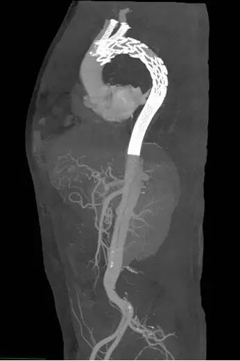 手术过程非常顺利,王兵副院长亲自操刀,整个手术过程仅耗时2小时。术后在施敏护士长带领的护理团队精心的护理下,患者恢复良好,术后复查CTA(见下图),主动脉支架位置良好,破口封堵满意,无内漏,两个“烟囱”支架通畅,无脑梗塞、肢体及内脏缺血等并发症的发生。现在大家悬着的心完全放了下来,叮嘱患者一定要控制血压,按时随访,复查CTA评估支架的情况。