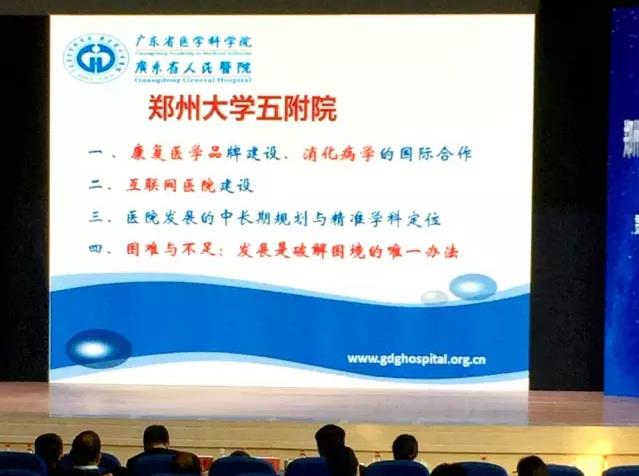 在专家点评环节,国家卫生计生委科技发展研究中心副主任代涛,首都医科大学北京友谊医院理事长、党委书记辛有清,原广东省卫生计生委正厅级巡视员廖新波,广东省人民医院党委书记耿庆山对郑州大学五附院的发展思路给予积极肯定,对康复医学品牌建设,消化病学的国际化合作以及互联网医院建设方面给予了高度评价。