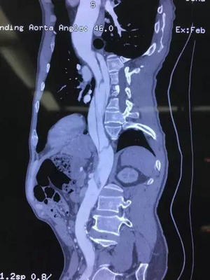 如采取常规的腔内隔绝术,势必会对左锁骨下动脉形成封堵,造成后循环及左上肢缺血,轻者造成头晕及左上肢无力、发凉,重者可能造成严重的后循环缺血梗死。既往可采取的方法包括“烟囱”技术、体外“开窗”技术、“分支”技术及“复合”手术技术,“烟囱”技术固有的内漏率较高,体外“开窗”技术及“分支”技术操作复杂、费用较高,而“复合”手术技术则存在创伤较大、围手术期风险高等缺点。结合该患者,以上方法均无法开展。