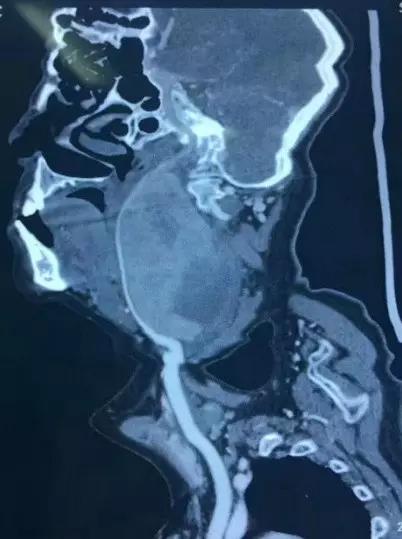 53岁的谷阿姨家住驻马店市,10年前无意中发现左颈部一肿块,鸡蛋大小,因无症状一直未在意。1周前感冒咳嗽,一次剧烈咳嗽后包块突然增大,并伴有疼痛、呼吸困难,病情进展迅速,很快出现言语及进食困难,不能平躺,一天到晚只能坐在床上,不能入睡,异常痛苦。当地医院束手无策,推荐患者来到郑州大学五附院血管外科(郑州大学血管外科研究所)找王兵教授。来院时患者左颈部包块已占据整个左颈部,完全不能说话,气道被肿块压迫,严重右偏,随时有窒息风险。(图1)