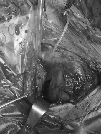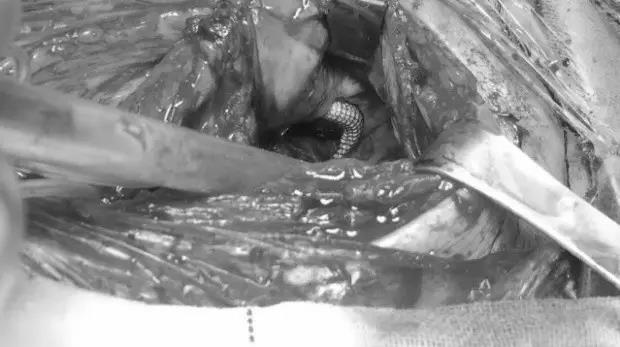 让人意想不到,也是无比惊险的一幕出现了,医生们赫然看到支架在瘤腔内穿过,支架的2/3是在血管外走行,就像是在破裂的颈动脉两端架起了一座“桥梁”——这是生命之桥!看到这一幕,大家都感到后怕,若贸然切开瘤体或支架向远端少放1cm,则患者再无手术机会,生存机会渺茫。(图3、图4、图5、图6)