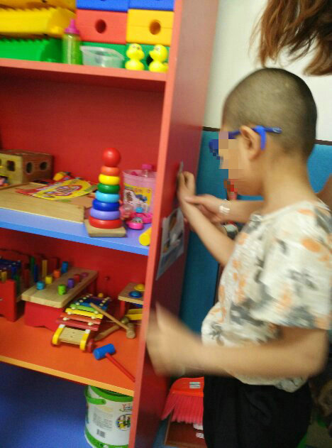取任务卡,放下,找到自己的小脚印,自己脱鞋子,自己摆放鞋子,找个玩具玩一会儿。自理能力的提高在康复训练中是很重要的。