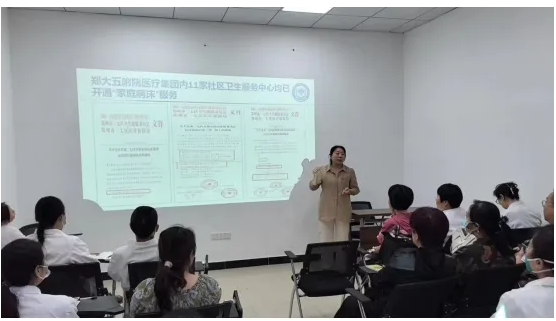 目前,郑州大学第五附属医院自牵头开展“家庭病床”以来,推行‘医院—社区—家庭’三位一体的家庭病床管理模式,持续推进医防融合。现医疗集团内有家庭病床团队30个,医生总人数40人,护士总人数30人。定期针对医疗集团内知州大学第五附属医院福华街分院、郑州市福华北街社区卫生服务中心、郑州市二七区侯寨中心卫生院、郑州市二七区侯寨社区卫生服务中心、郑州市二七区嵩山路社区卫生服务中心、郑州市二七区五里堡社区卫生服务中心、郑州市建中街社区卫生服务中心、郑州市二七区马寨镇卫生院、郑州市二七区蜜蜂张社区卫生服务中心、郑州市大学路社区卫生服务中心(郑州交通医院)10家家庭病床开展单位进行政策讲解、业务培训、业务指导、质量控制等工作。