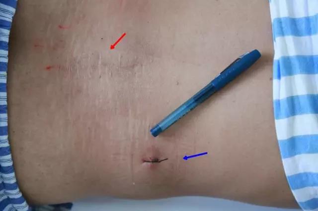 红色箭头指示为老刘20年前行开放式手术留下的刀口,蓝色箭头指示本次微创手术留下的刀口。