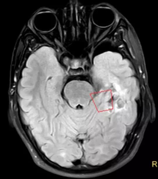 图1 红框所示左颞叶病变,考虑低级别胶质瘤