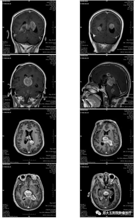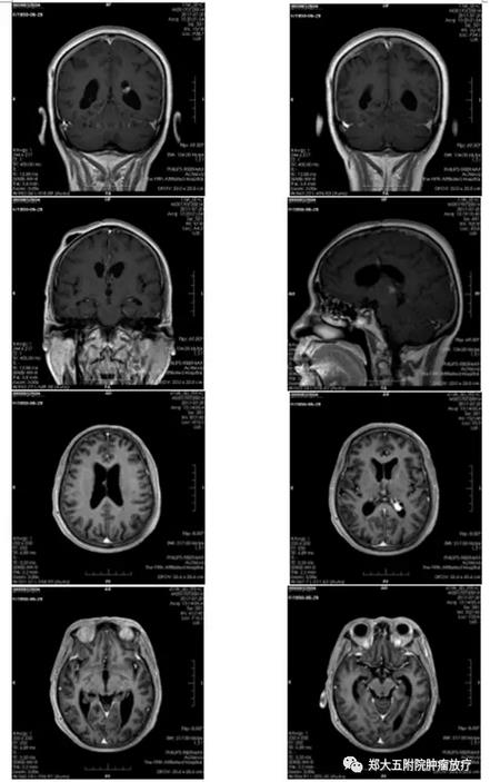 2017年4月29日,王大妈来到了郑州大学五附院接受治疗,先是住进了神经外科,神经外科主任医师寿纪新主任介绍说:“当时病人外院核磁共振显示两侧脑室、三脑室、四脑室及松果体内见多发占位,合并梗阻性脑积水、脑室周围脑白质间质性脑水肿及脊髓转移,病情重,病灶广泛,无法手术切除”。为缓解脑积水,给病人进行了“三脑室底造瘘+脑室腹腔分流术”,手术后患者病情稳定、症状改善出院。