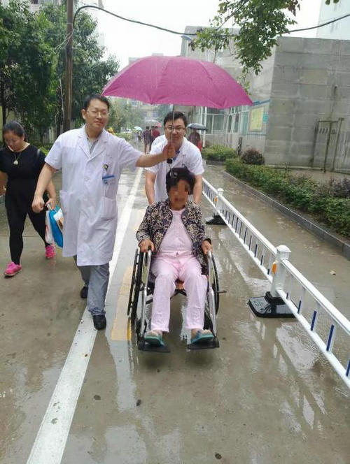 张长江主任认真听取了高阿姨的病情后认为有可能是老年人骨质疏松性椎体压缩骨折,建议早日治疗。高阿姨于当日14∶36赶到郑州大学五附院,此时天空依然下着雨,因为走的急,雨具都忘记带了。张长江主任团队里的付卫平,余耀坤两位医师一个为高阿姨撑伞,一个手推轮椅,这样的举动感动了来院治疗的其他患者。清洁的不仅仅是雨水冲涮过的马路,还有医者的内心。