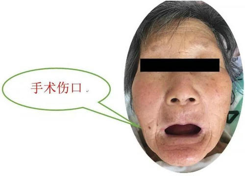 ▲术后第一天:患者精神状态良好,右侧面部无触痛,面带笑容,下床活动,恢复正常饮食,右侧口角手术伤口创可贴覆盖。