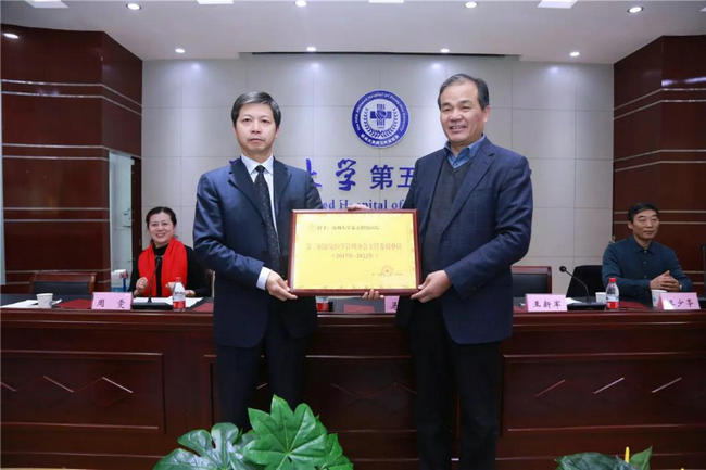 马保根会长向王新军教授颁发河南省医院协会授予郑州大学五附院“第二届康复医学管理分会主任委员单位”牌匾。