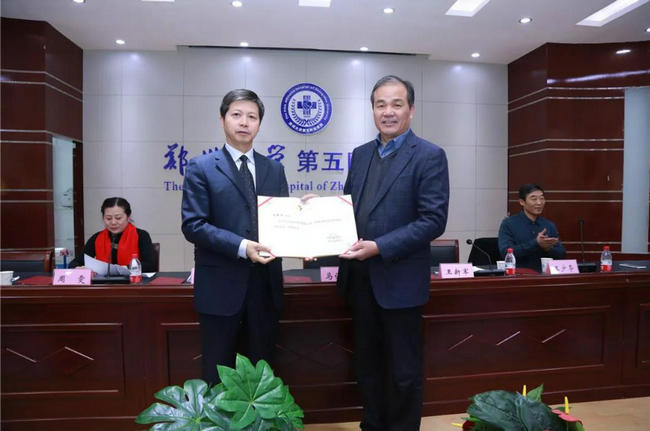 马保根会长向王新军教授颁发河南省医院协会授予的“第二届康复医学管理分会主任委员”聘书。