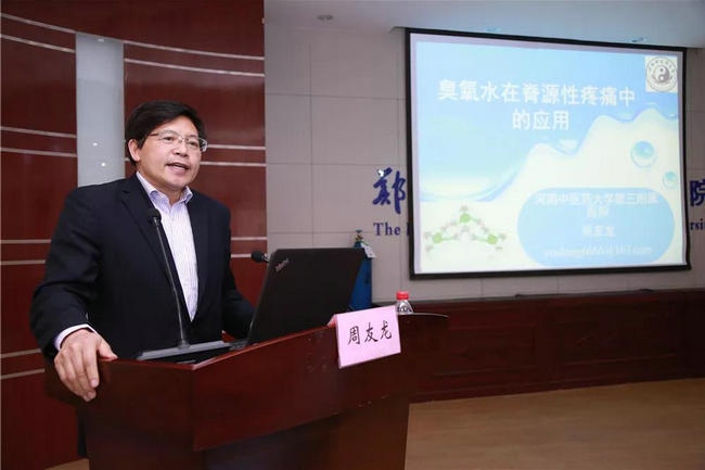 ▲ 郑州大学五附院特聘专家王振豫教授向大家汇报了《提高臭氧治疗椎间盘突出症疗效的探讨》。