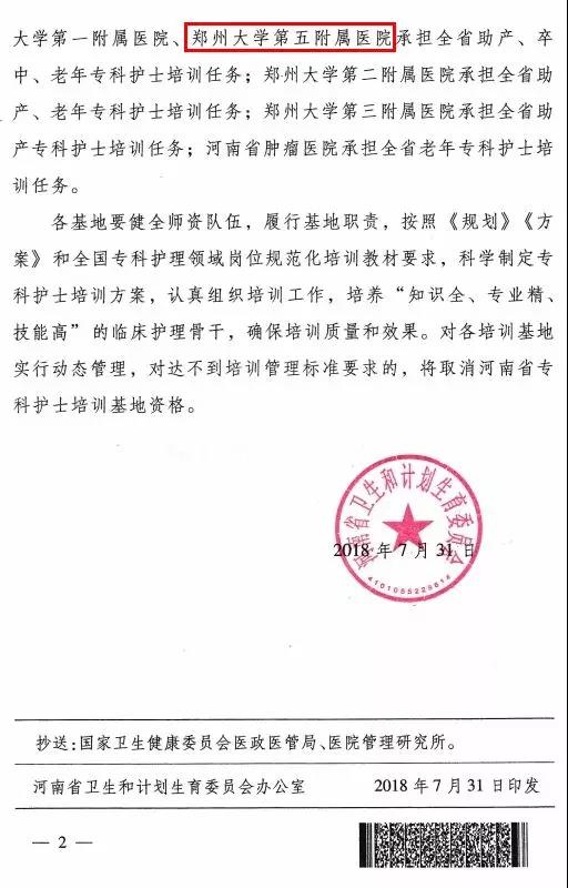 2018年7月31日,从省卫计委传来喜讯,郑州大学五附院正式获批助产、卒中、老年三个省级专科护士培训基地,标志着省卫计委对医院近年来在专科护理领域付出的努力及取得的成绩给予充分肯定,医院专科护理工作从此迈上新的台阶。
