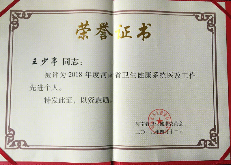 近日,郑州大学五附院在医院管理方面荣获多项荣誉后再传喜讯,医院荣获河南省卫健委颁发的“2018年度河南省卫生健康系统医改工作先进单位”荣誉称号,医院副院长王少亭被评为“2018年度河南省卫生健康系统医改工作先进个人”。