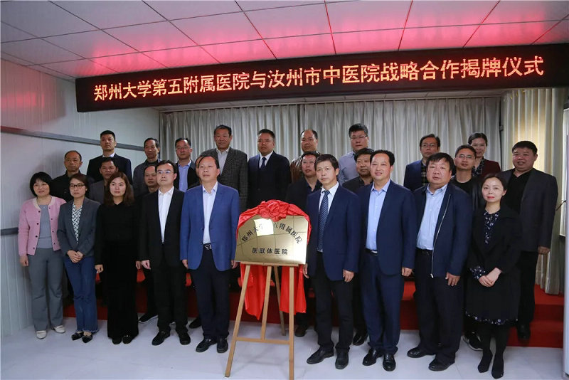 签约揭牌仪式在汝州市中医院举行。郑州大学五附院党委书记王新军、工会主席朱光、汝州市卫健委主任张武钦、汝州市红十字会会长郭光宗、汝州市中医院党委书记王福帅、院长张宇航等领导参加了启动仪式。仪式由汝州市中医院院长张宇航主持。