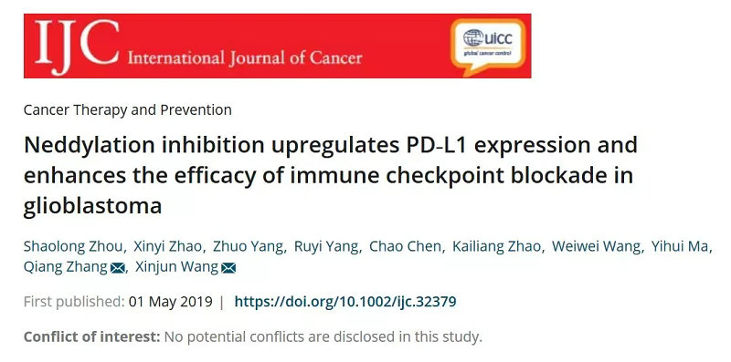 近日,郑州大学五附院王新军教授团队在国际肿瘤权威期刊《International Journal of Cancer》(IJC)发表题名为《Neddylation inhibition upregulates PD-L1 expression and enhances the efficacy of immune checkpoint blockade in glioblastoma》的文章。医院神经外科周少龙博士与美国密西根大学综合肿瘤中心放射肿瘤学系赵心怡教授为共同第一作者;王新军教授与美国密西根大学综合肿瘤中心放射肿瘤学系张强教授为共同通讯作者。该杂志2017年影响因子为7.36,在2018年最新中科院分区为一区,该文章的发表标志着王新军教授团队在脑胶质瘤基础研究方面取得了突破性研究成果。