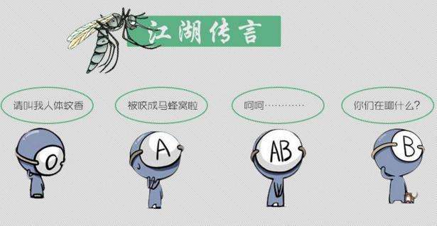 长久以来,有关蚊子的“血型说”在民间广为流传。普遍的说法是:蚊子偏爱O型血与A型血的人。事实上,蚊子并不会区分人的血型。一位叫Thornton的美国科学家为了研究血型、出汗情况、肤色、体毛等对蚊子叮咬的影响做了一个实验。这个实验消除了实验对象呼出的二氧化碳产生的影响,并在单独考察某种影响因素时最大可能的排除其他变量的影响。实验结果并没有发现蚊子叮咬与血型存在必然联系,肤色和体毛也同样没有影响,而出汗的影响则非常显著。这就可以解释为什么同一血型的人,有的饱受蚊子“青睐”之苦,有的却能享受蚊子“冷落”之幸。
