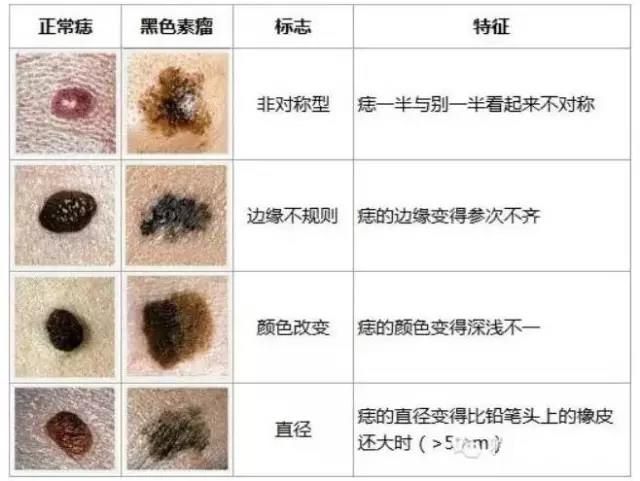 如果这些部位的黑痣发生突变,比如面积或体积突然增大,或近期突然颜色变深、变黑,比如褐色突然变黑或变蓝;痣上突然出血破溃,黑痣四周出现新的小黑点,就应尽早到医院诊治。